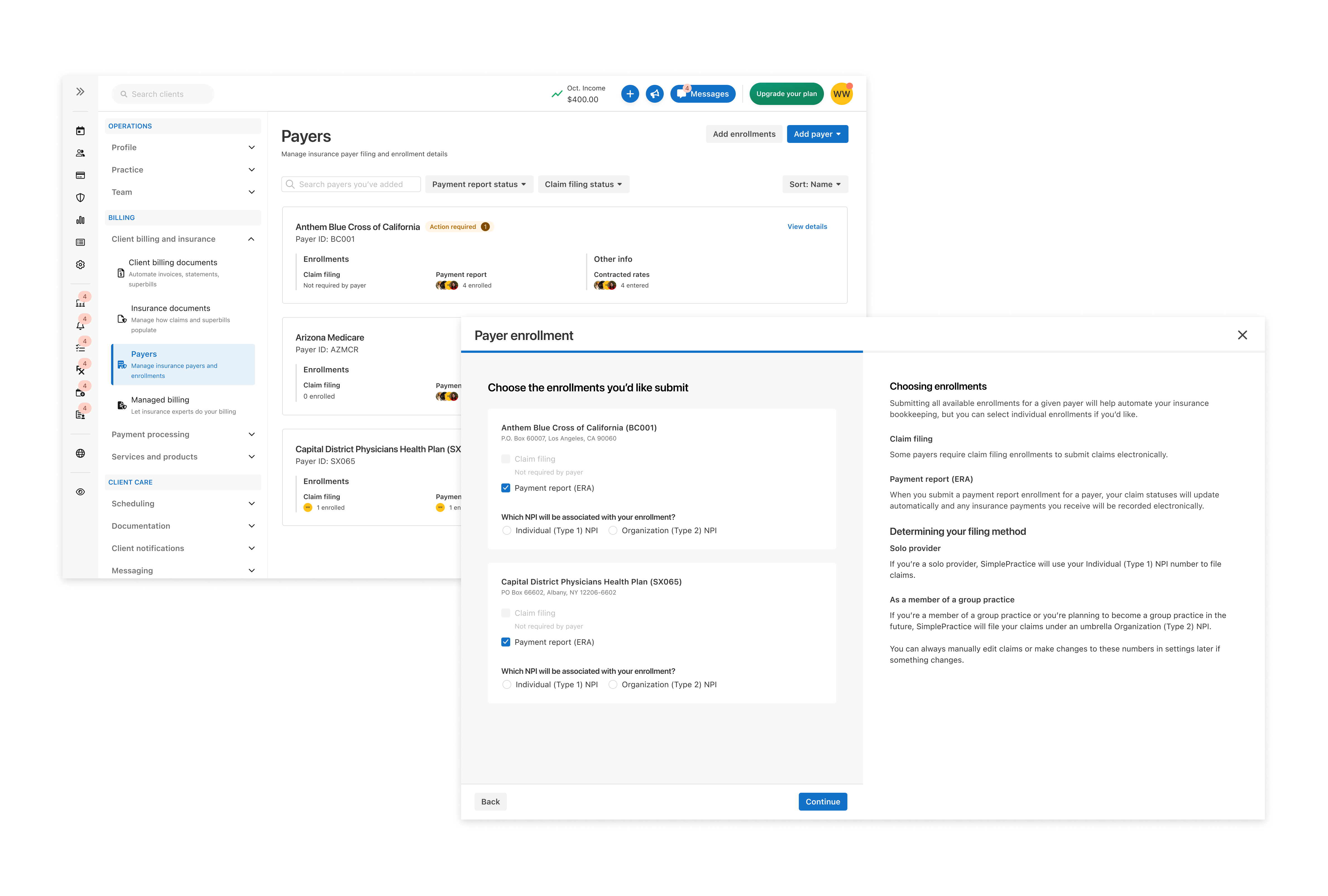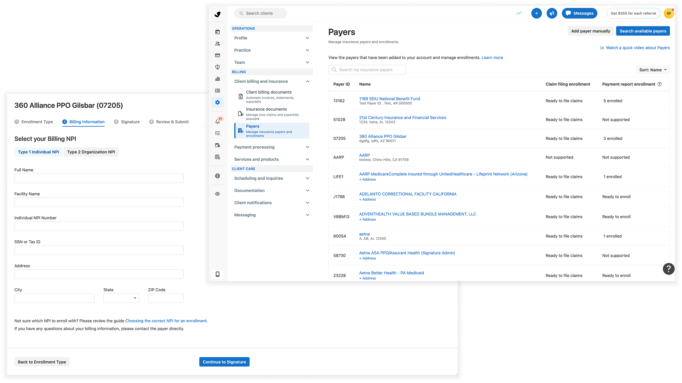 The insurance experience had various hurdles that users needed to jump – one of those being a hurdle of our own design! On average, clinicians work with 4-6 insurance companies, and our experience required them to manually enroll each one, forcing them to repeat the process over and over and over again.