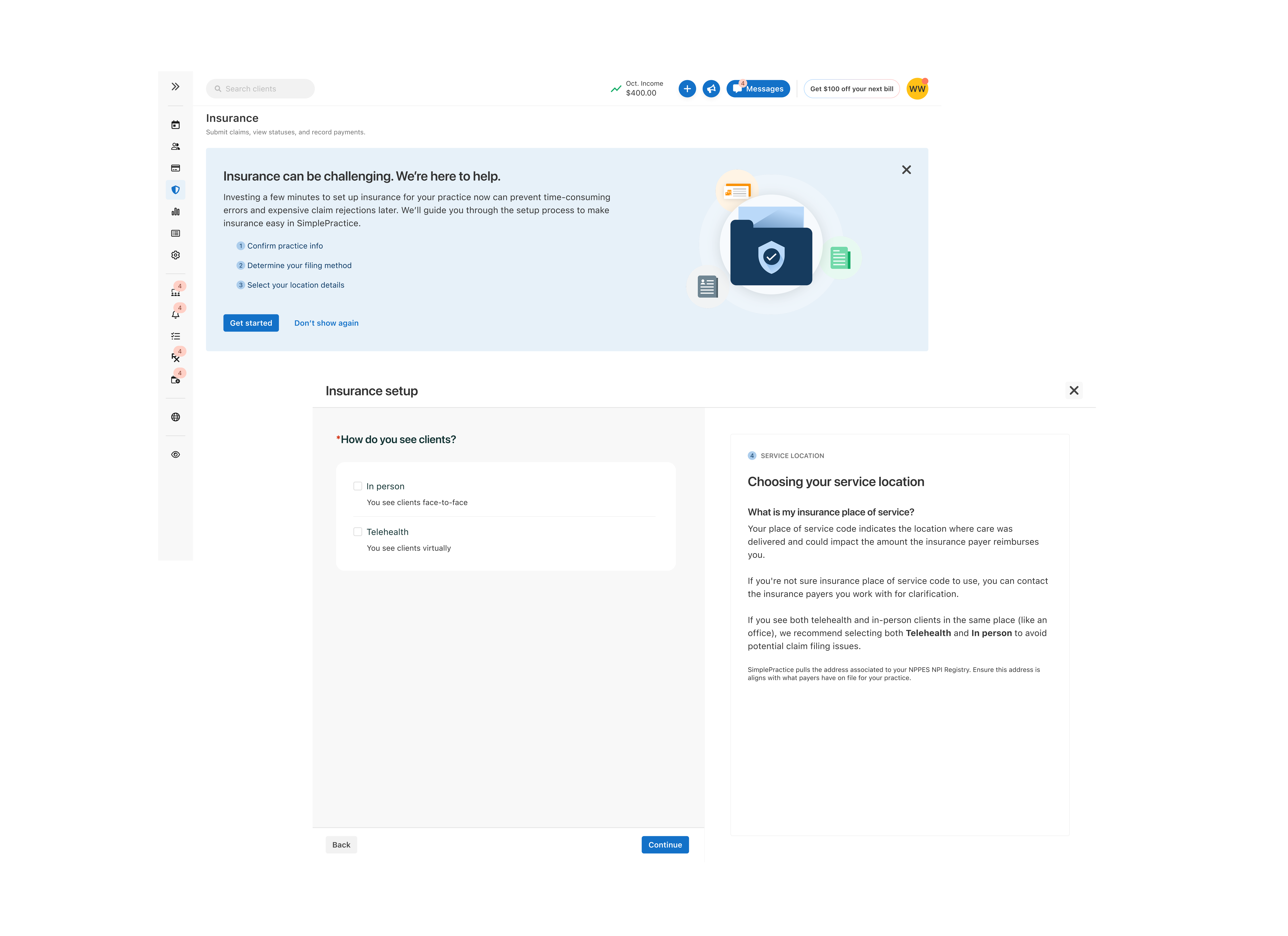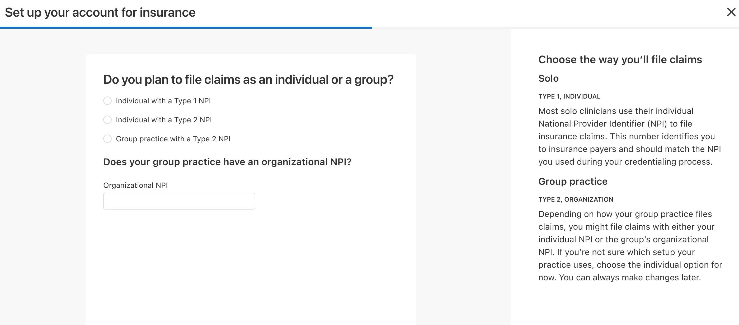 Our experience would throw new users into the deep end of the insurance claim filing experience, with no introductory onboarding or walkthrough. Clinicians would have to rely on a help center guide full of screenshots to get them through set-up. When I first joined the team, I walked through it myself, realizing it took over 19 clicks and 7 pages of the product to complete just the onboarding process. This was too much effort and time for our users and after feedback and review, it became one of our hypothesized reasons that clinicians weren’t even attempting to use our insurance tools.